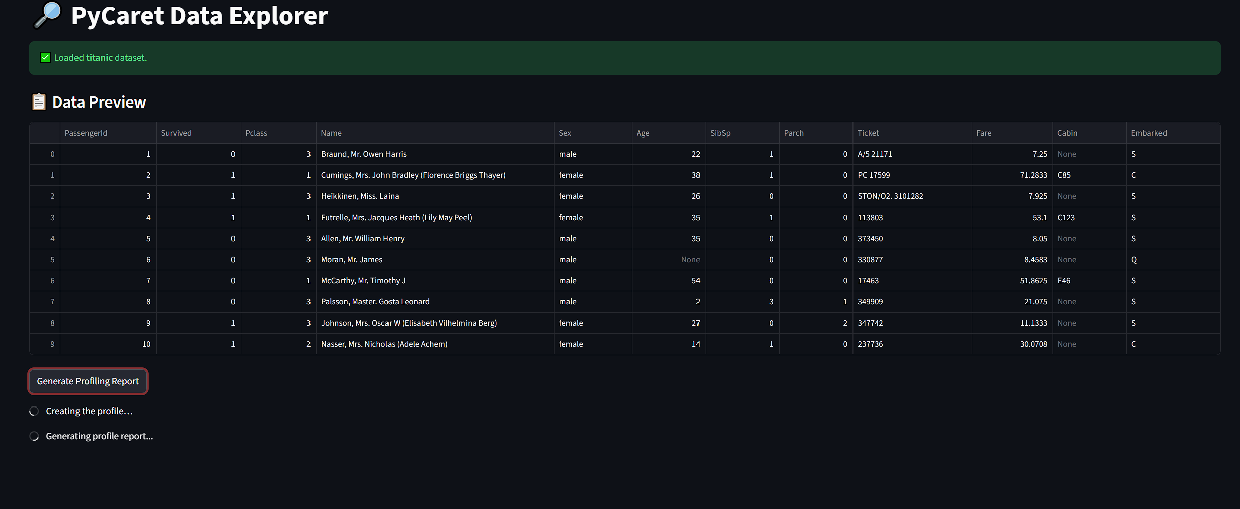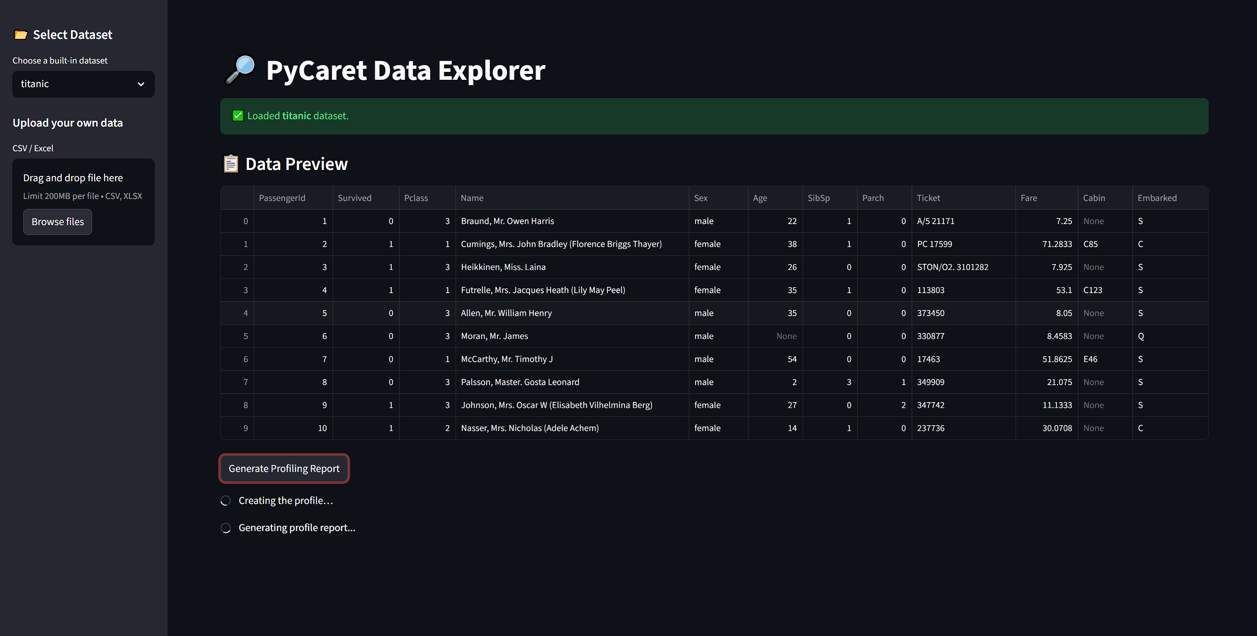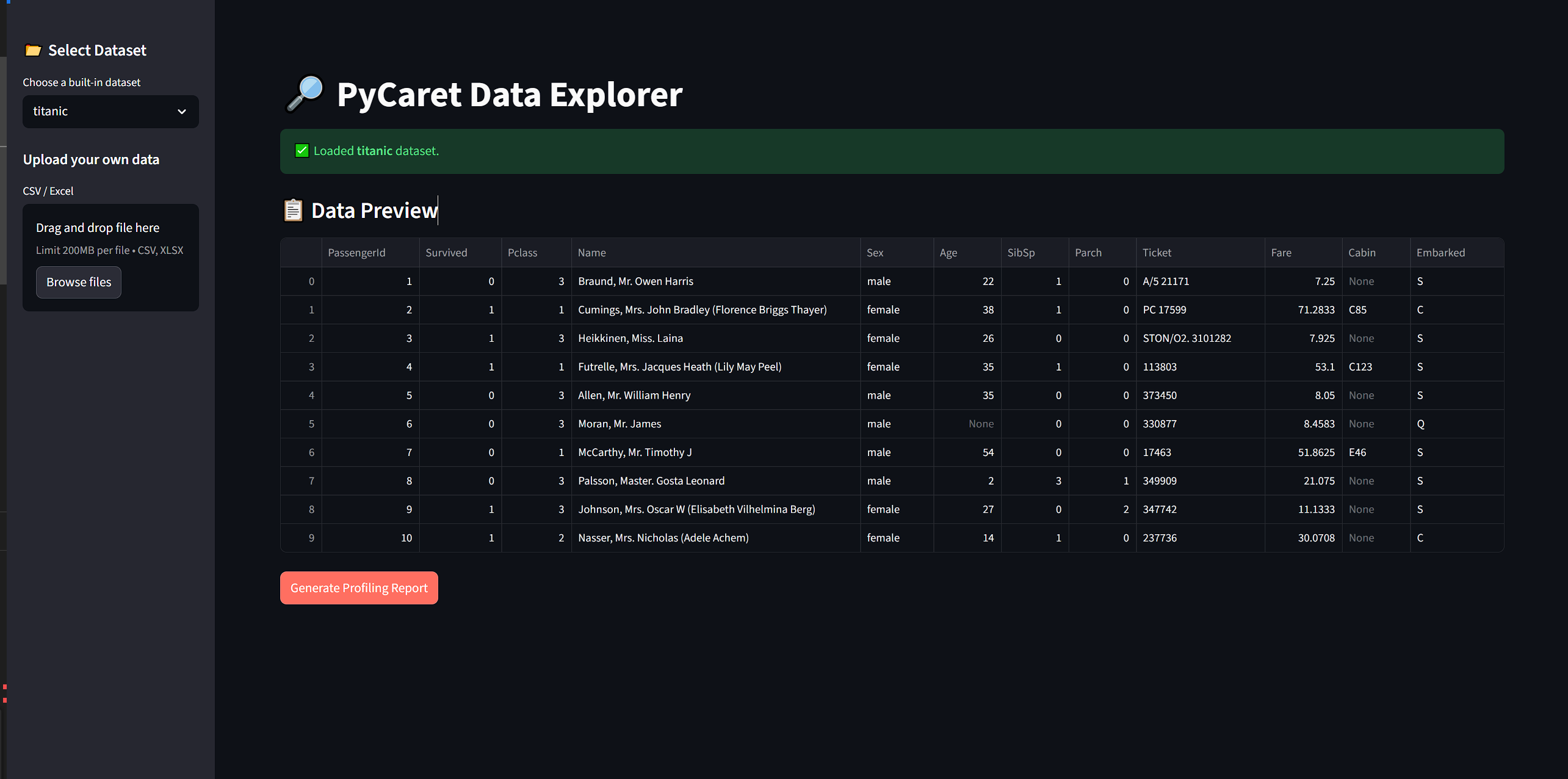 A lightweight Streamlit app that lets users load built-in or custom datasets and generate interactive data profiling reports using PyCaret and ydata‑profiling.