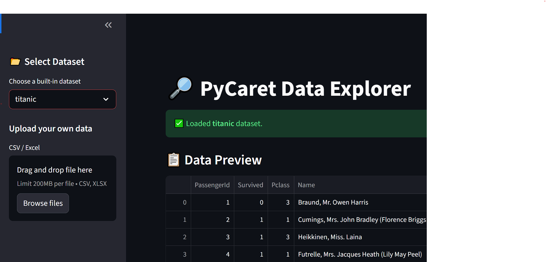 - Select a dataset from the list of built‑in PyCaret datasets via sidebar.