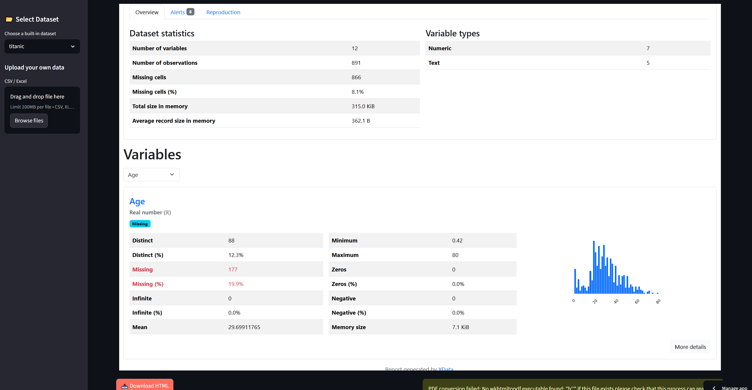 - Generate an interactive profiling report with ydata‑profiling.
