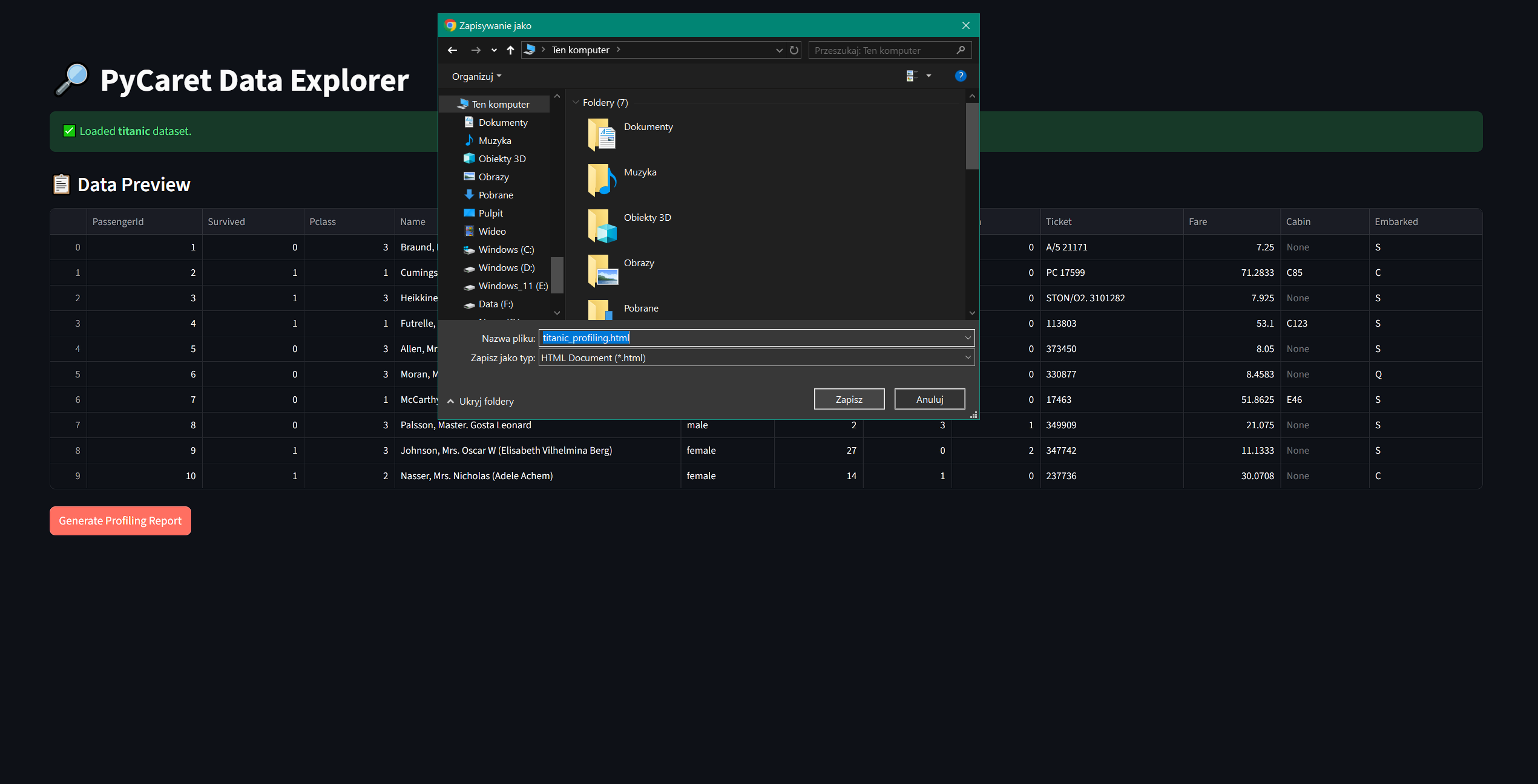 - Click "Generate Profiling Report" to view and download the report.