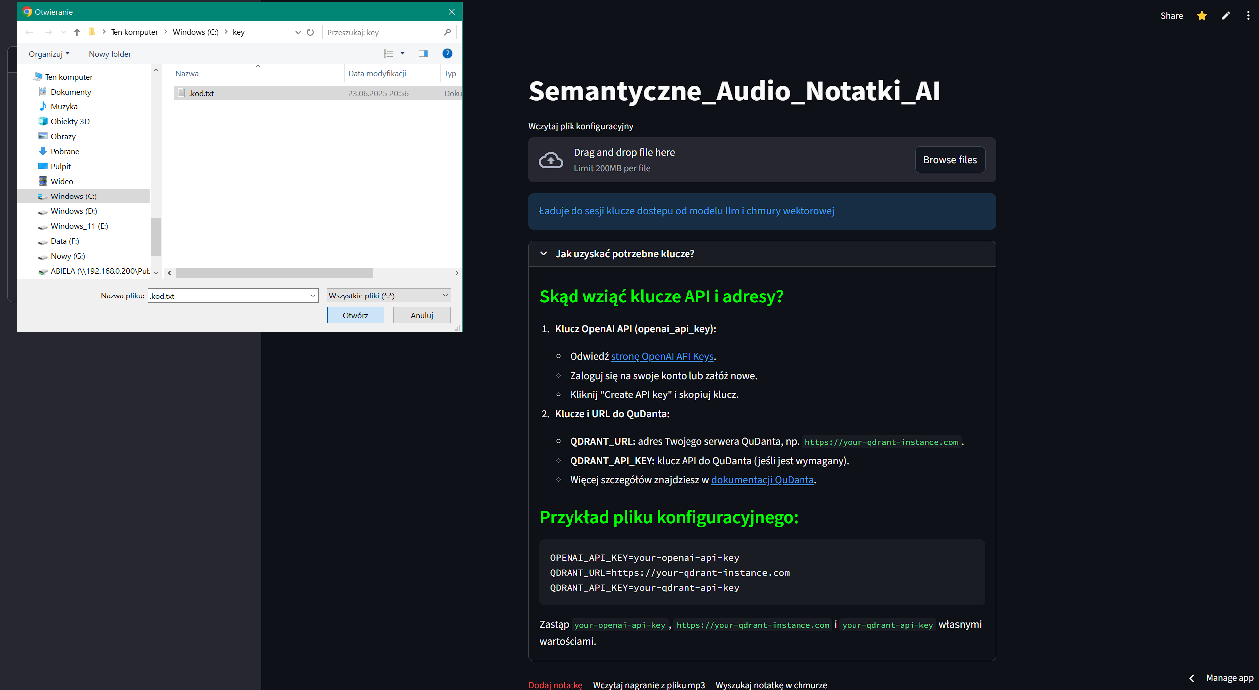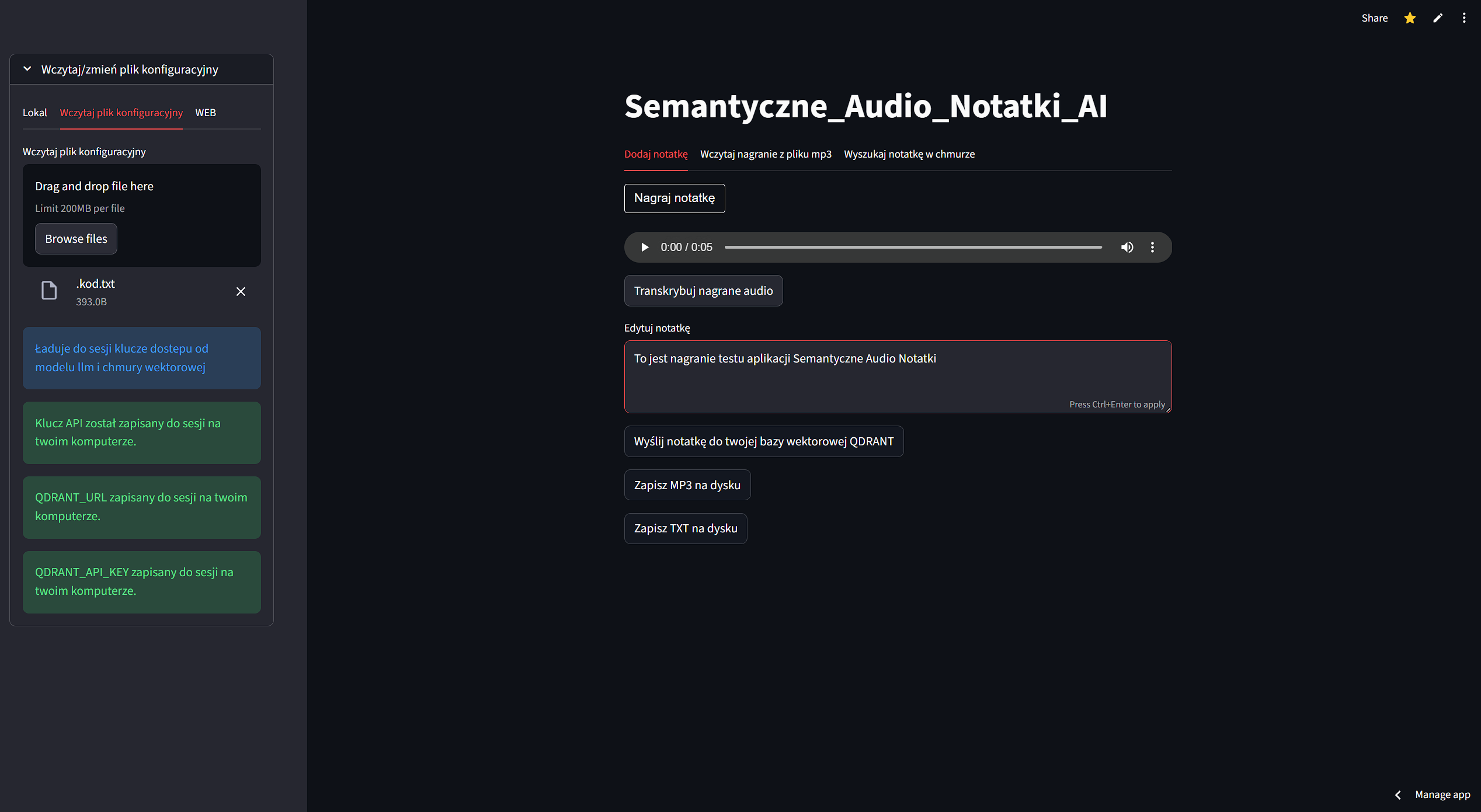 - Edit the transcribed text if needed, then click Wyślij notatkę do twojej bazy wektorowej QDRANT to store it.